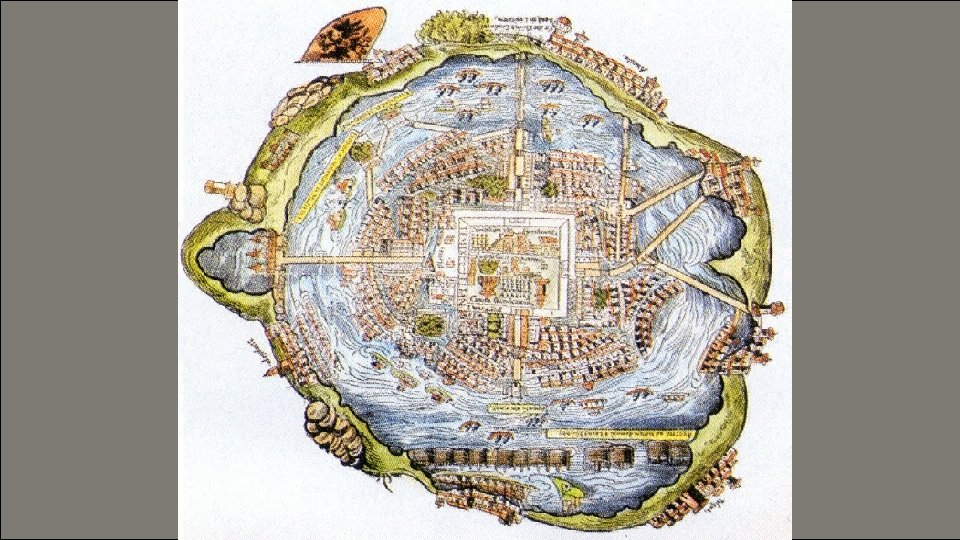 Tenochtitlan • This was the Aztec’s capital. • It was created in the center of a lake! • They built floating islands called “chinampas” by piling rich earth from the bottom of the lake onto rafts made of wood. • Roots of plants grew down to bottom, anchoring the rafts.