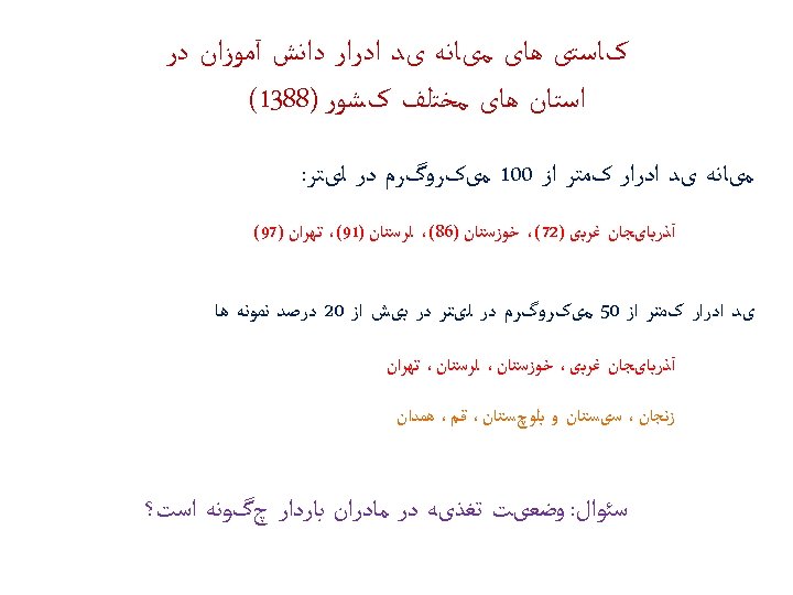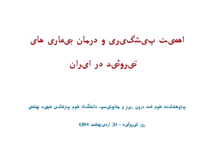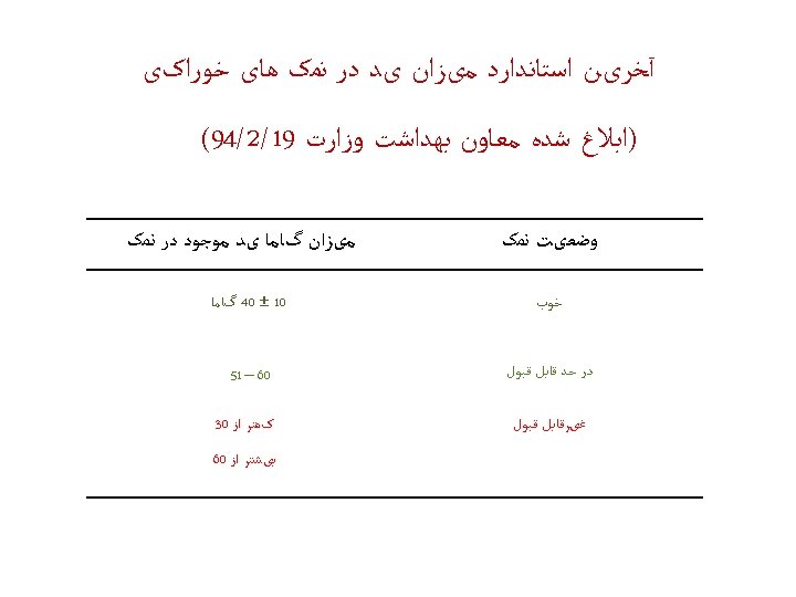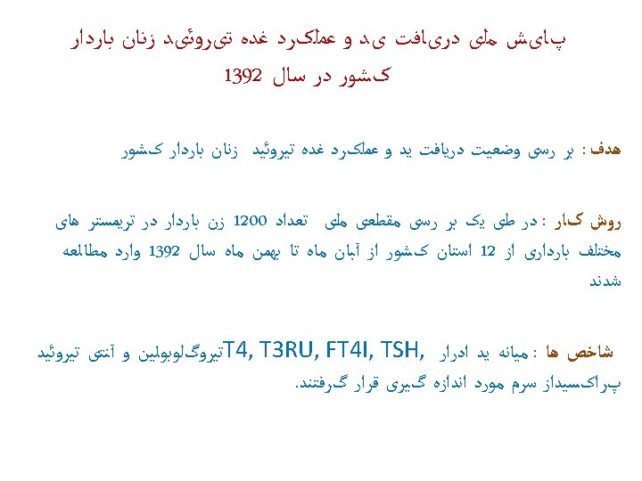 ﻧﺘﺎﻳﺞ کﻠی Min. Max. ﻣیﺎﻧﻪ یﺪ ﺍﺩﺭﺍﺭ UIE (µg /L) T 4 (µg/dl) TSH (mi. U/L) 20 4. 92 0. 01 400 Results 23. 92: Preliminary 14. 05 Mean 114 Median 98 11. 19 2. 20 10. 88 1. 95