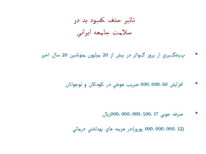 Monitoring progress towards sustainable elimination of IDD Iran-2007 Indicator Optimum Result >90% >98% <6% 5. 4% Median (n=3600) ≥ 100 134 µg/L proportion below 100μg/L <50% 12% <20% 5% 8/10 All 10 1. Salt iodization Proportion of households consuming effectively iodized salt 2. Goiter rate 3. Urinary iodine proportion below 50μg/L 4. Programmatic Indicators Attainment of the indicators listed