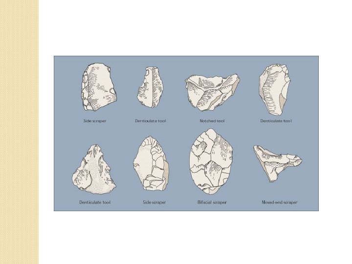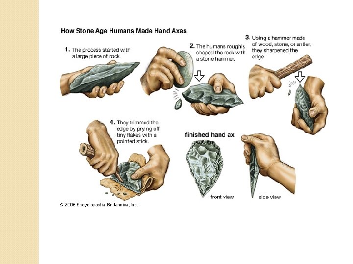 What tools or methods can we use to discover how Paleolithic people lived? The time before writing is called prehistory or the stone ages because people used stone tools. Historian- A person who studies and writes about the past since 5, 500 years ago when writing was invented Archaeologists look for fossils and artifacts of tools and other objects. What artifacts do archeologists look for? They look for fossils and artifacts* that tell stories about people animals or cultures of long ago. How are fossils and artifacts different? Fossils are traces of plants and animals, while artifacts are weapons, tools and other things made by humans Anthropologists focus on how a society works. *Artifacts- tools, weapons, pottery and other belongings from long ago. Fossils are traces of plants or animals that are preserved in rock.