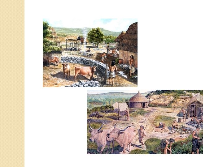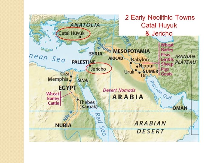 The Growth of Villages Farmers lived close to the fields in simple mud brick houses that were built close together. Houses were decorated with wall paintings. People built houses of worship. They farmed, hunted, raised sheep and goats, and ate fish and bird eggs. Jericho is one of the oldest villages dating back to 8, 000 BCE. Catal Huyuk, part of modern day Turkey was a big village from 6700 to 5700 BCE.