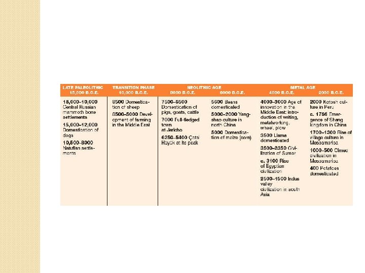 What were the Ice Ages? Long periods of extreme cold from about 100, 000 BCE to 8, 000 BCE People had to change their diets, use fur for clothing and build better shelters.