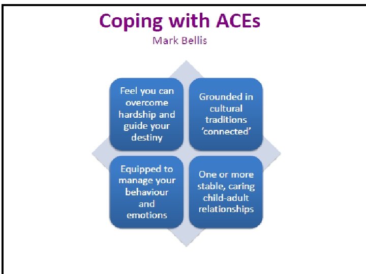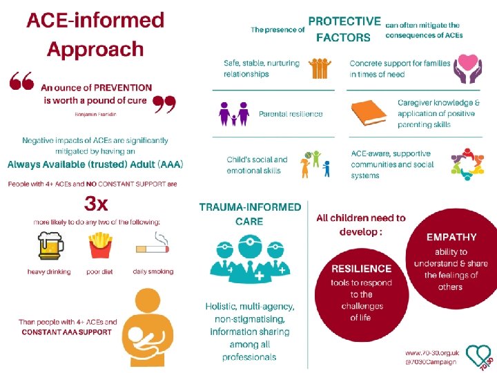 Adverse Childhood Experiences • Children who are routinely exposed to situations such as domestic violence, mental ill health, alcohol and other substance misuse problems in their homes experience a negative impact which can last well into adulthood. • These chronic stress situations are called Adverse Childhood Experiences (ACEs) and are often associated with poorer outcomes for children in educational attainment, employment, involvement in crime, family breakdown, and a range of health and wellbeing measures.
