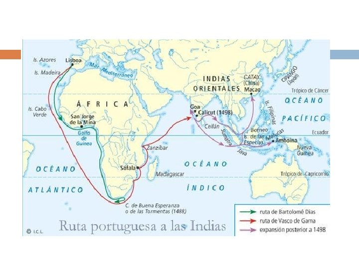 1. 3. PORTUGUESE DISCOVERIES HENRY THE NAVIGATOR promoted a school to encourage sailing methods. The objective of Portuguese was to reach India surrounding Africa. Different stages: MADERIRA, AZORES AND CABO VERDE (from 1418 to 50 s) GULF OF GUINEA (70 s) BARTOLOMEU DIAS rounded the CAPE OF GOOD HOPE. VASCO DE GAMA arrived CALICUT (India) in 1497.