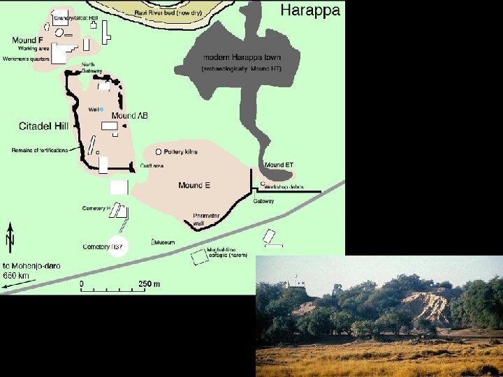Components of Mature Harappan Sites • An acropolis (citadel) on high platform, which may have had administrative function, surrounded by workshops, markets, and living quarters in a lower level • Extensive public sewer and drainage systems • Craft specialization; complex engineering and maintenance; increase in social stratification and diversity of material culture, including the use of luxury goods • Appearance of a system of writing, uniform system of weights and measures, and common systems of urban planning and artifact types