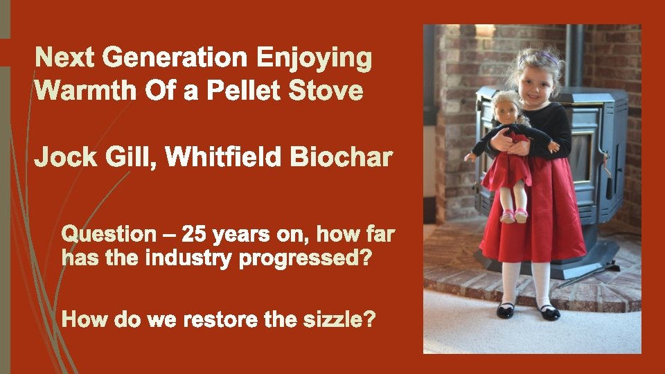 Looking forward, can we see opportunities for growth? Clean Energy is a huge opportunity We recognize the critical need for processes that remove excess CO 2 from the atmosphere • Early days saw wood pellets as a beneficial “carbon neutral” fuel • Today this is not strictly accurate nor does it address the problem fully Can our industry address the problem, create new markets and put the sizzle back in the pellet stove? Yes, we can
