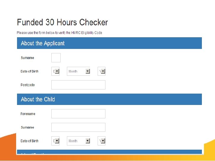 Checking Eligibility-Extended Entitlement 30 hours free childcare • It is the HMRC who determine eligibility of parents and not providers or the local authority. • If parents think they are eligible they need to go to the CHILDCARE CHOICES website and set up an account and apply. • If they are successful they will be given an 11 digit eligibility code, parents must give the code to all the providers who are offering funded hours for their child. • The code the parents have will have a start and an end date. • The start date is the date the code was issued and not the date the child can start (term after their 3 rd birthday) • The end date shows when the parents will need to reconfirm.