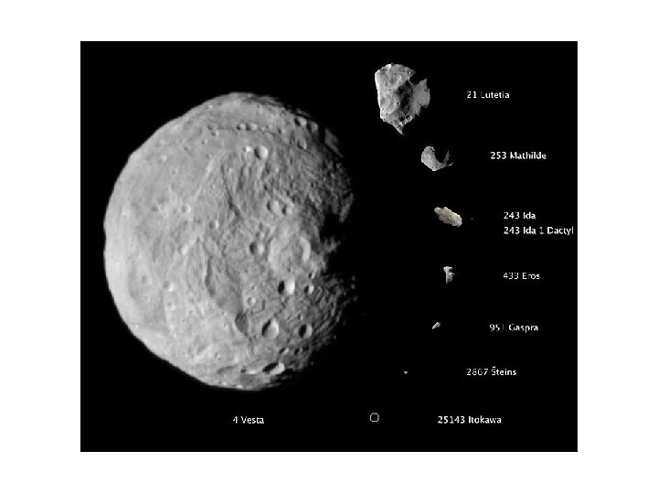 Ceres Hubble image Mysterious bright spot. An intact, surviving protoplanet! 1/3 rd the asteroid belt’s mass. Density: 2. 1 g/ccm Equatorial radius: 487 km Albedo: 0. 09 Carbonaceous (C-type) Hydrated minerals. Possibly partially differentiated. ? ? ?