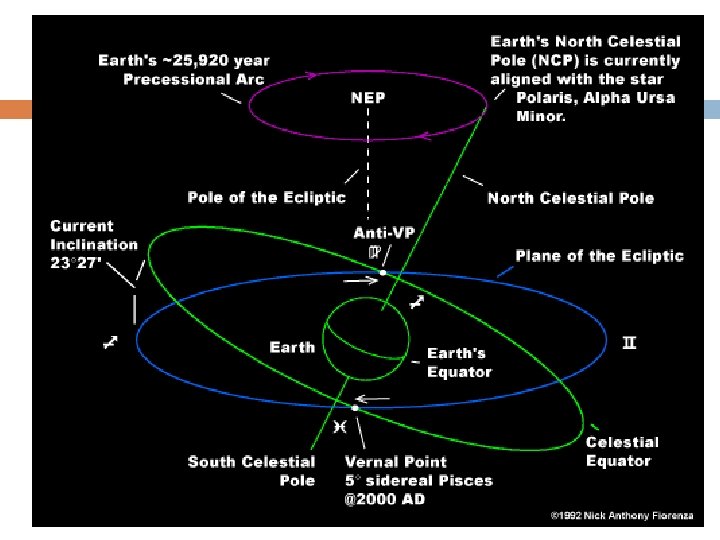 Nutation: (Latin nutare, "to nod") • Nutation is, in astronomy, a small irregularity in the precession of the equinoxes • Nutation superimposes a small oscillation, with a period of 18. 6 years and an amplitude of 9. 2 seconds of arc, upon this great slow movement. • The cause of nutation lies chiefly in the fact that the plane of the Moon's orbit around the Earth is tilted by about 5°from the plane of the Earth's orbit around the Sun.