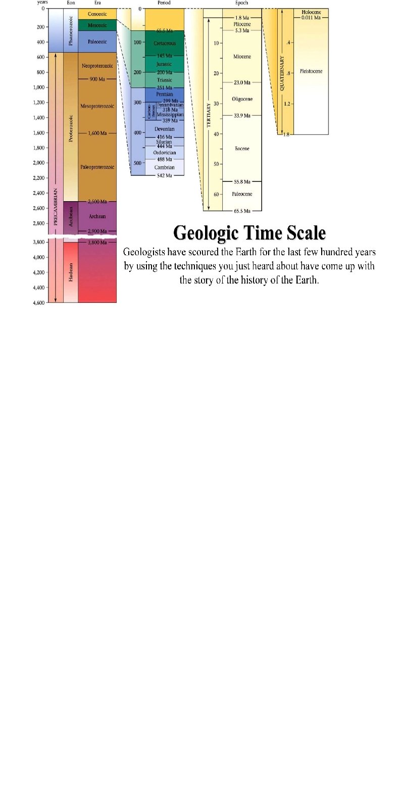 Paleontologists have made a detailed record of the evolution of life through Earth’s history. This record is the basis for the geologic time scale and is referred to as relative time. The geologic time scale subdivides the 4. 5 billion year history of the Earth into shorter time periods, based on changes in fossils. The broadest division of geologic time is the Eon. There are two Eons, the Pre. Phanerozoic (or Precambrian) and Phanerozoic. The Precambrian stretches from the formation of the Earth 4. 5 billion years ago until the start of the Phanerozoic Eon, about 560 million years ago. There are many fossils in Pre. Phanerozoic rocks, but they are almost all microscopic. Phanerozoic means "visible life. " The rocks of the Phanerozoic Eon, which covers about the last 560 million years of Earth history, are characterized by abundant visible fossils.