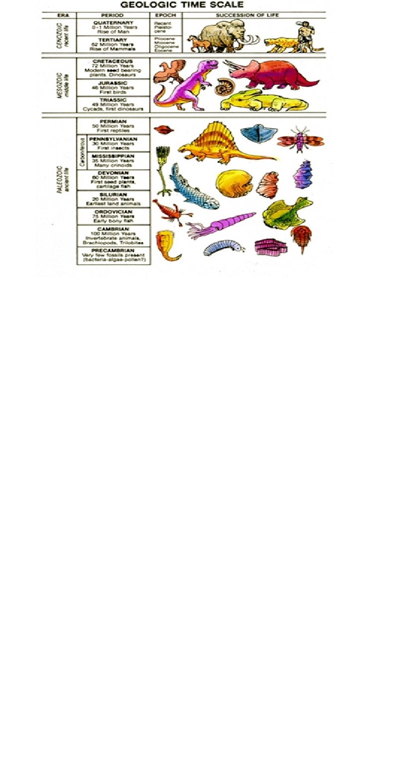 Era Period Epoch Plant and Animal Development Cenozoic Quaternary Holocene (. 01) Humans develop"Age of mammals" Extinction of dinosaurs and many other species. Pleistocene (1. 8) Tertiary Pliocene (5. 3) Miocene (23. 8) Oligocene (33. 7) Eocene (54. 8) Paleocene (65. 0) Mesozoic Cretaceous (144) "Age of Reptiles" First flowering plants, First birds Dinosaurs dominant. Jurassic (206) Triassic (248) Paleozoic Permian (290) "Age of Amphibians" Extinction of trilobites and many other marine animals, First reptiles, Large coal swamps, Large Amphibians abundant. "Age of Fishes" First insect fossils, Fishes dominant, First land plants "Age of Invertibrates" First fishes, Trilobites dominant, First organisms with shells Carboniferou s: Pennyslvani an (323) Carboniferou s: Mississippia n (354) Devonian (417) Silurian (443) Ordovician (490) Cambrian (540) Precambria ncomprises about 88% of geologic time (4500) First multicelled organisms, First one-celled organisms, Origin of Earth