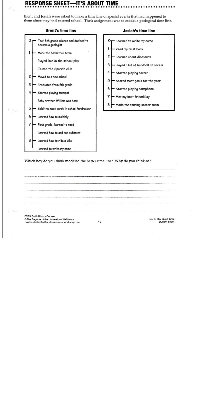 n the chart, write the above events in order in the third column labeled. Sequential Time. Write them so that the most recent event is at the top of the list and the event that occurred first is at the bottom of the list. Leave space between each event so that you fill the whole column. our completed list is now similar to what a geologist might refer to as a Sequential Time Line. You can use your own sequential time line to describe events in your life. For instance, I learned to ride my bike after I learned to walk, but before I started second grade. Return to the time line worksheet: n the middle column, Numerical Time, place a zero by today’s date. Then think of the number of years ago each event happened. Write these numbers in the column in front of each event. If you can't remember exactly, try to guess and round off to the nearest whole year. These numbers are the numerical ages of the event and make up a numerical time line. ow you can use both the sequential and the numerical information to describe events in your life. Using both of these, you would describe when you started kindergarten as: I started kindergarten four years ago, after I learned to walk, but before I lost my first tooth. Think of another event which has occurred in our life. For example, the first time that you rode on a Ferris Wheel. Your probably cannot remember the exact year when that occurred, but you probably can place it between two events which you can remember. Therefore, you would know its relative time. How could you give it a numerical time? he Earth's Geologic Time Line has been arranged and developed in a similar manner.