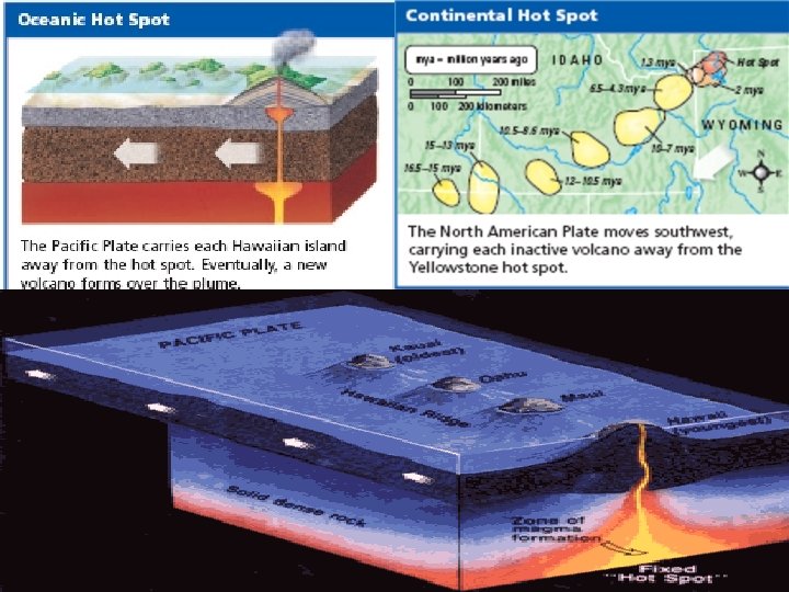 HOT SPOTS are relatively small, long-lasting hot regions where magma rises in plumes. Magma plumes develop into volcanoes that can build up and eventually become a volcanic island or mountain. Hot spots occur far from plate boundaries, yet tell us how fast and in what directions plates are moving. The Hawaiian Islands and Yellowstone are examples of hot spot volcanoes.