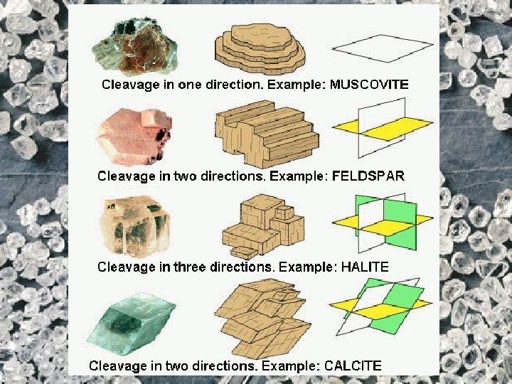 Mineral Breakage: always look on the edges of minerals to distinguish this property! • Cleavage – If a mineral breaks along smooth, even surfaces • Fracture – If it breaks with uneven or jagged surfaces (bumpy)