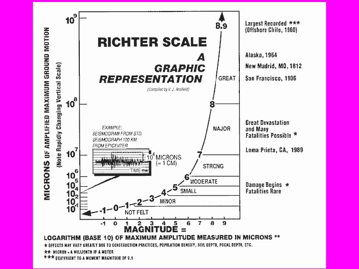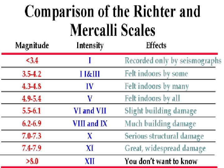 Scales of Earthquake Intensity/Magnitude • Largest quake ever recorded subject of some debate, but is either Alaskan (1964) at 9. 2 or one in South America (1976) which may have been near 9. 5.