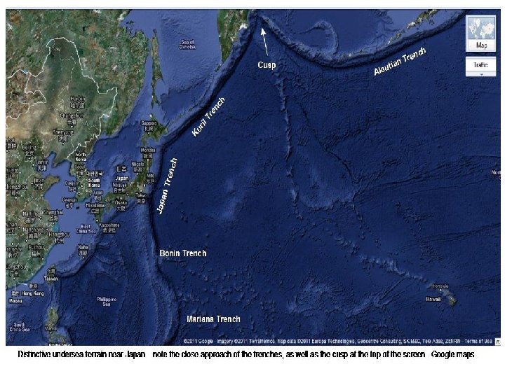 Ocean Structure Features of the Ocean Floor • Deep Ocean Trenches – long, narrow, arcshaped depressions in the ocean floor. – Created when the tectonic plate is being dragged under another by tectonic forces.