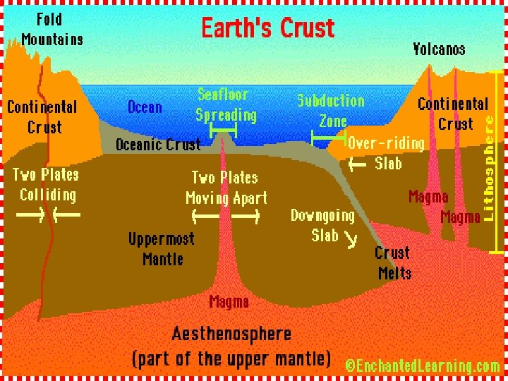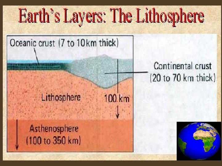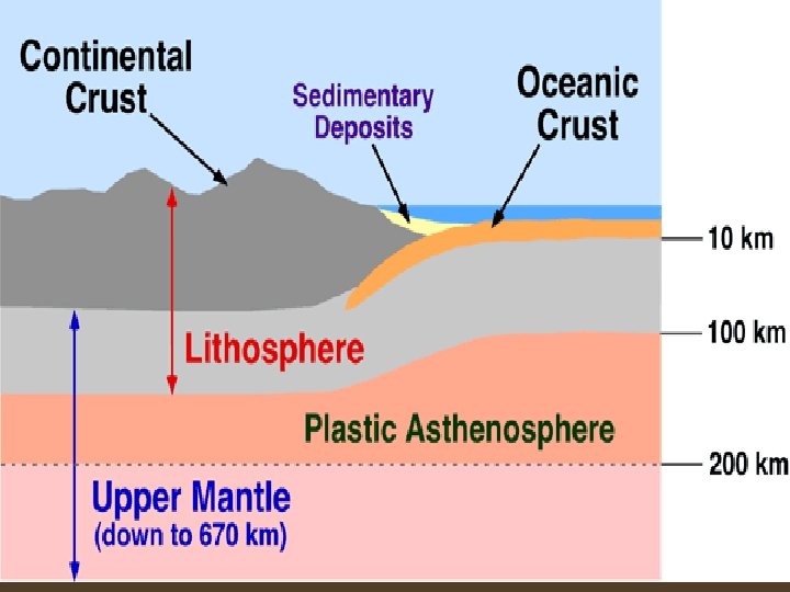 Lithosphere Crust v outermost layer v thinnest Ø thickness beneath the ocean is 5 km. Ø thickness beneath continents averages about 30 km. Ø base can be as deep as 100 km. v dense v most rigid/solid v coldest v Quartz (silicon dioxide), feldspar, silicon, magnesium, aluminum Mantle Core v middlemost layer v thicker than the crust Ø 2, 900 km thick v innermost layer v thickest Ø made up of two distinct parts: a 2, 200 km-thick liquid outer core and a 1, 250 km-thick solid inner core v denser than the crust v semi-solid rock v hot v contains more iron, magnesium, and calcium v densest v molten v hottest v metallic (ironnickel alloy)