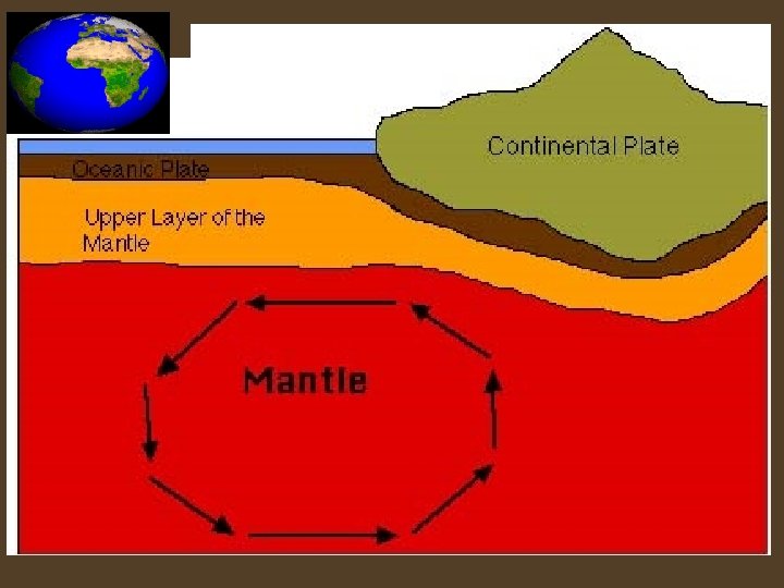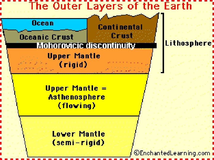 Physical Structure of the Earth (5 Layers) • Lithosphere- rigid outer layer (crust) thin silicate rock material • Asthenosphere- solid rock that flows slowly (like hot asphalt) • Mantle - middle layer • Outer Core- liquid layer • Inner Core- solid, very dense