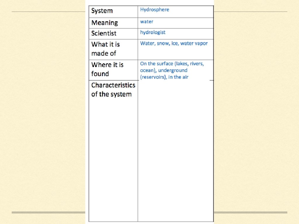 HYDROSPHERE Does anyone know another name for the water cycle? We are going to learn about the hydrosphere and make a map of the names of the parts of the hydrosphere we live.