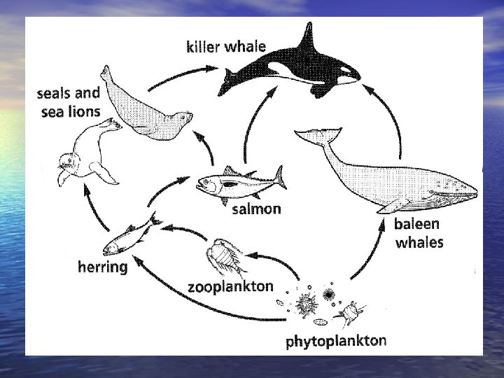 42. What is a keystone species? – Example: In the food web above, killer whales are the keystone species. If they are removed from the environment, there will be too many salmon, which will provide more food for the seals and sea lions who’s population will increase, then seals and sea lions along with salmon will eat all of the herring, which will lead to too many zooplankton, which will eat all of the phytoplankton, which will lead to not enough food for the baleen whale (and less oxygen).