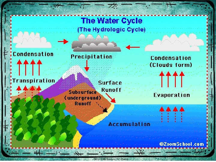 • evaporation – most takes place over the ocean • transpiration – plants release water to air through leaves • condensation – clouds form as water vapor cools • precipitation – water droplets in clouds become heavy and fall back to Earth • groundwater – water that fills the spaces in soil and rock layers
