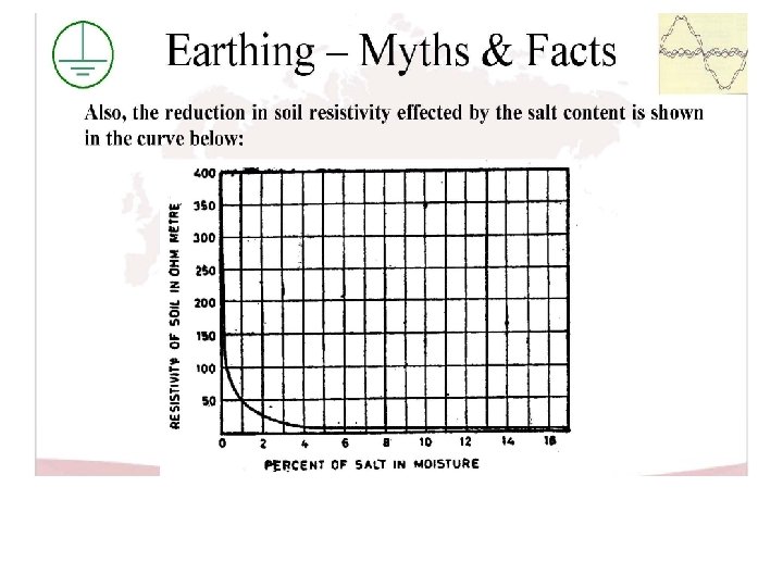 Earthing – Myths & Facts • As it can be seen from the above, the curve flattens off at about 5 percent. A further increase in salt content will give a very little decrease in soil resistivity. The salt content is expressed in percent by weight of the moisture content in the soil. Considering 1 M 3 of Soil, the moisture content at 10 percent will be about 144 kg. (10 percent of 1440 kg). The salt content shall be 5% of this (i. e. ) 5% of 144 kg, that is, about 7. 2 kg.
