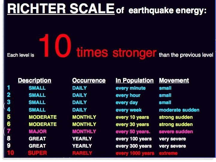 EARTHQUAKE MAGNITUDE AND INTENSITY • Magnitude is the measurement of the amount of energy released during an earthquake. • The Richter scale is a numerical scale based on the size of the largest seismic waves generated by a quake that is used to describe its magnitude. – Each successive number in the scale represents an increase in seismic-wave size, or amplitude, of a factor of 10. – Each increase in magnitude corresponds to about a 32 -fold increase in seismic energy.