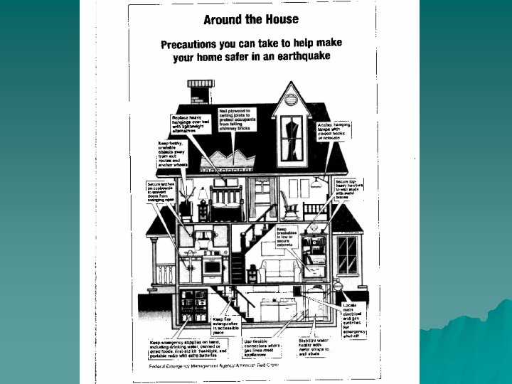 Home Earthquake Preparedness Secure Pictures Secure Hot Water Heater Wrench Near Emergency Gas Shut Off Secure Heavy Items Know Safe Spots in Every Room – Sturdy Tables, Desks Know Dangerous Spots in Every Room – Windows, Hanging Objects, Fireplace, Appliances