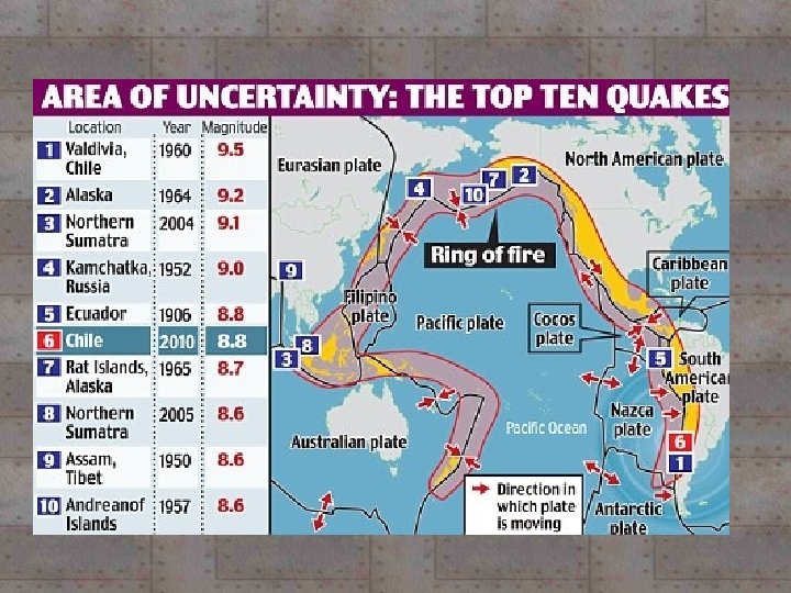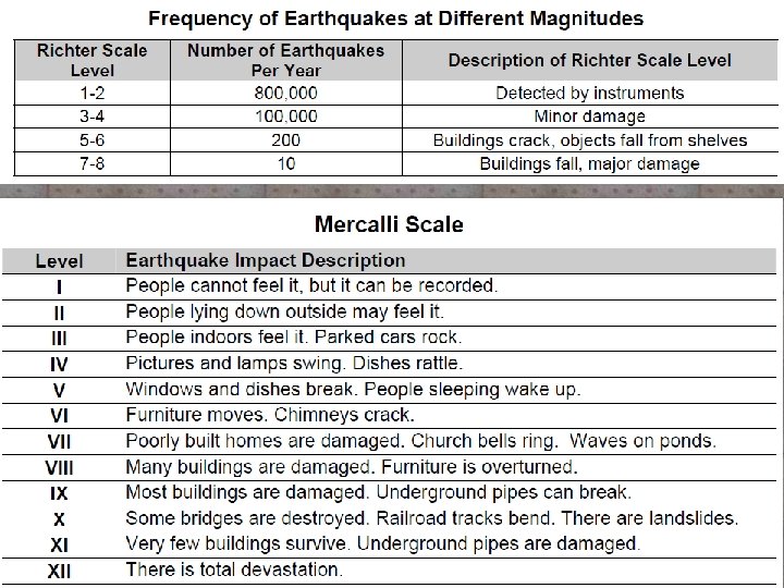 Earthquake Magnitude -Richter Scale – most used. -begins at zero, goes through 10 -each increase on scale is ten times greater. -Mercalli Scale – based on damage. Ranges from I through XII.