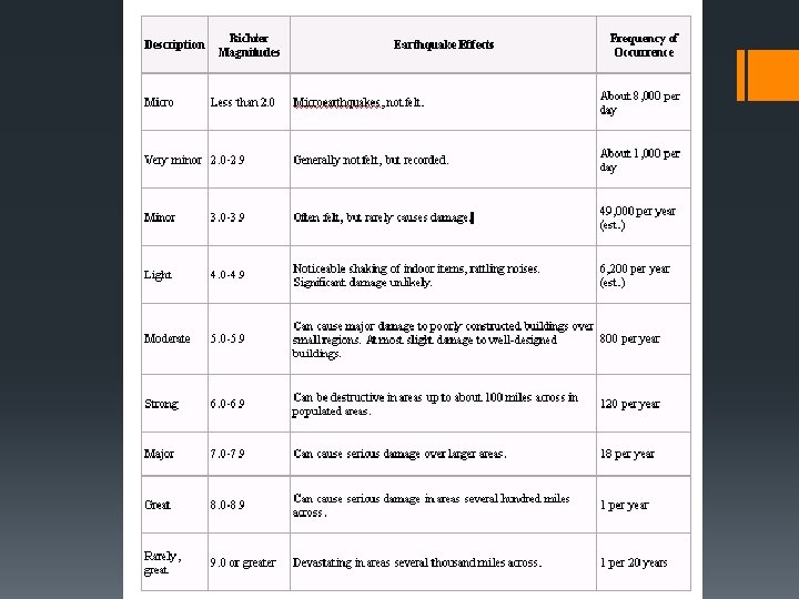 Richter Scale § This is used to express the magnitude of an earthquake. § Magnitude is a measure of the energy released by an earthquake. § Each increase of one whole number of magnitude represents a release of 31. 7 times more energy than that of an earthquake measuring one whole number lower. § An 8 would be 31. 7 x 31. 7 (~1000) times more than a 6