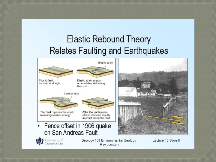 Causes of Earthquakes � Eventually the strain becomes so great that it is able to overcome the force of friction. The plates move suddenly causing an earthquake. This is known as the elastic rebound theory.