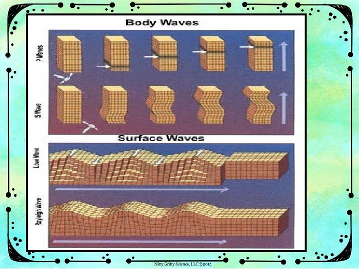 Three types of Seismic Waves • Primary waves (P waves) – compression waves that travel through solids and liquids, compressing and expanding the material they pass through, temporarily changing volume • Secondary waves (S waves) – only travel through solids and temporarily change the shape, but not the volume of the material they pass through; move slower than P waves • Surface waves – move slower than P and S waves, but can produce severe ground movement with a wavelike motion