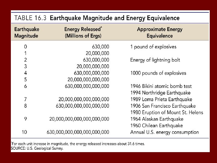 Magnitude scales § Richter magnitude - concept introduced by Charles Richter in 1935 § Richter scale – Based on amplitude of largest seismic wave recorded – LOG 10 SCALE Each unit of Richter magnitude corresponds to 10 X increase in wave amplitude and 32 X increase in Energy