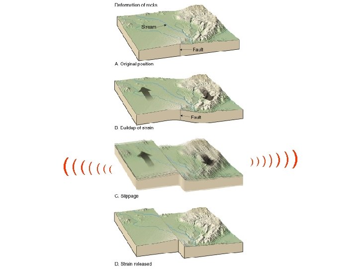 Elastic rebound 2 § Earthquake mechanism – Slip starts at the weakest point (the focus) – Earthquakes occur as the deformed rock “springs back” to its original shape (elastic rebound) – The motion moves neighboring rocks – And so on.