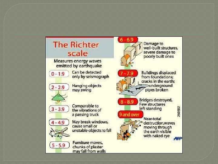 Magnitude �Measure of how much energy is released. �Richter scale is used to plot, from 1 – 10, how strong an earthquake is. �Each increase in 1 equals 10 times more energy released.