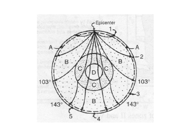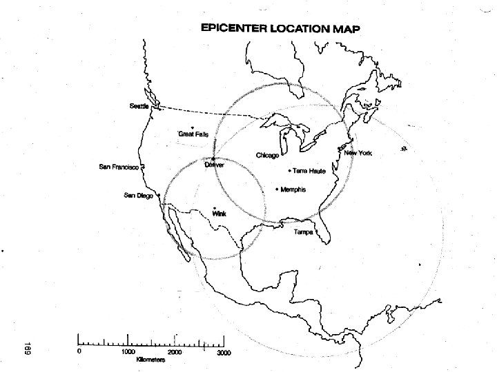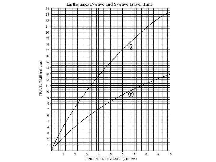 Distance to epicenter • Use scrap paper and mark off 0 min and the difference in arrival times • Slide the paper so that… – The left edge of paper is straight up and down – The 0 min mark hits the P-Wave curve – The other mark hits the S-Wave curve • Go straight down and read the distance off the bottom axis