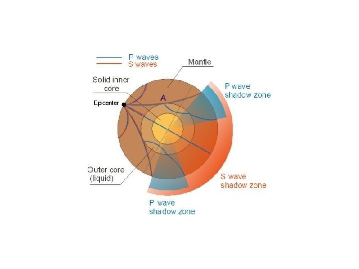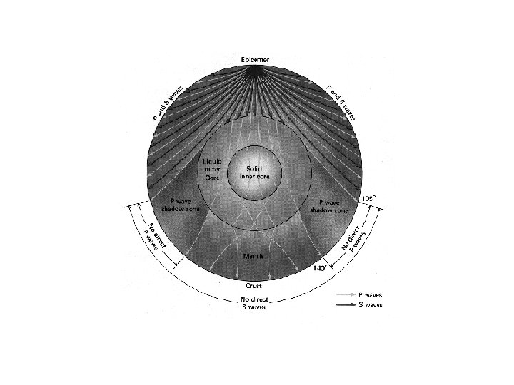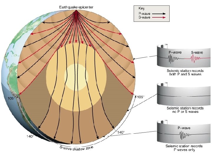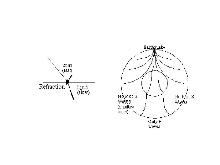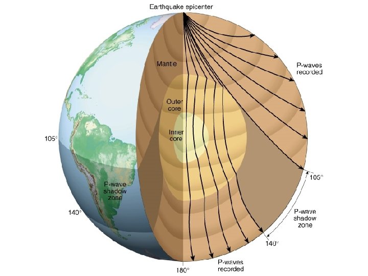 Where do the waves go? • The refraction (bending) of the waves as they enter different layers with different densities creates a shadow zone where no seismic waves are detected • S-Waves are absorbed when they reach the liquid outer core so there is an S-Wave shadow where only P-Waves are detected