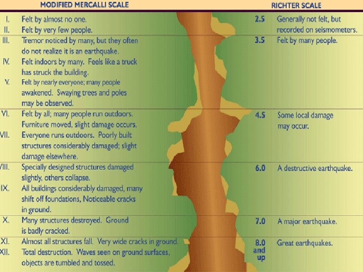 WAYS TO MEASURE AN EARTHQUAKE • There are two major scales to measure an earthquake: – Mercalli Scale: measures earthquake intensity (by amount of damage caused) – Richter Scale: measures earthquake magnitude (strength)