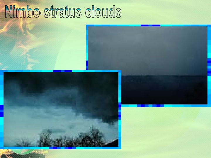 Clouds • LOW CLOUDS – form at 2, 000 m or less in altitude • Cumulus – puffy clouds formed when air currents rise and carry moisture • Stratus – layered dull, gray sheets that can cover the entire sky • Nimbostratus – low, dark, thick layers that hide the Sun