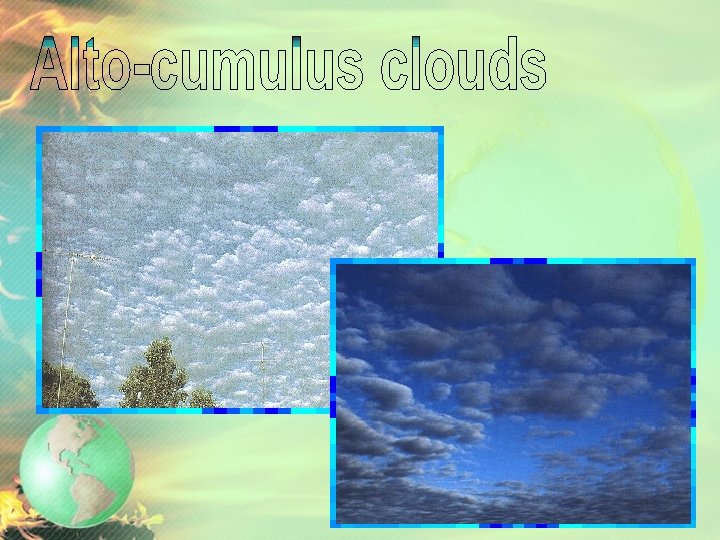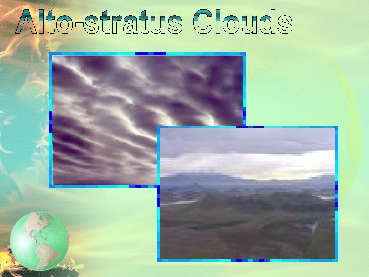 Clouds • MIDDLE CLOUDS – form between 2, 000 m and 8, 000 m in altitude • Most are layered • Names have alto- prefix (altocumulus and altostratus) • Can produce light precipitation
