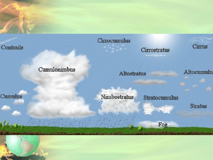 Clouds • Shape • Stratus-smooth, even sheets or layers at low altitudes • Cumulus-puffy, white clouds, often with flat bases • Cirrus-high, thin, white feathery clouds made of ice crystals • Height • Cirro – high clouds • Alto – middle-elevation clouds • Strato – low clouds • Nimbus clouds are dark and so full of water that sunlight can’t penetrate them