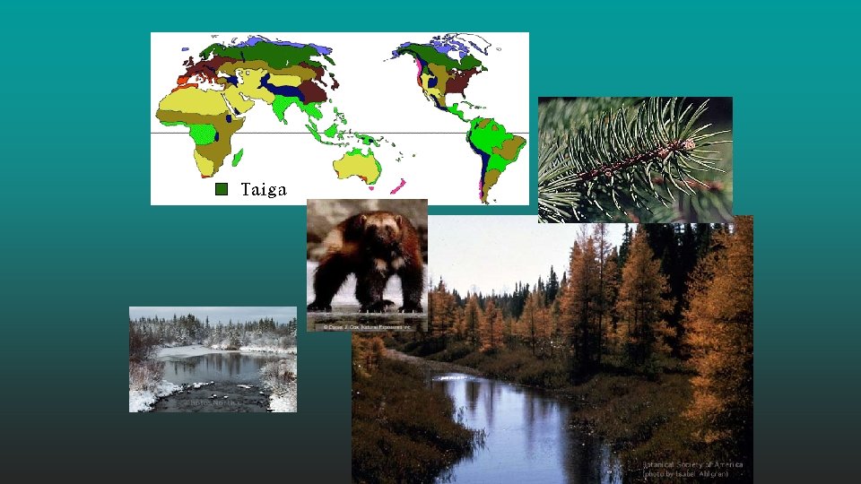 b. Taiga/Boreal Forest • Location: South of Tundra region. • Sunlight: more sunlight year-round = longer growing season than Tundra. • Soil: slightly acidic soil; supports lots of plants. • Plants: variety of plants/shrubs- mostly conifers (evergreens), fewer shrubs. • Animals: woodpeckers, moose, bear.