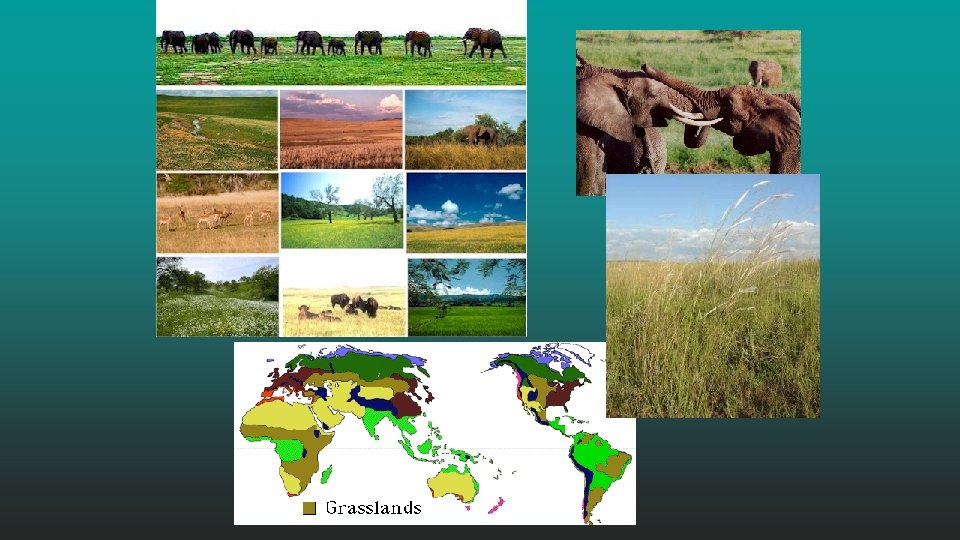d. Grassland • Location: anywhere that has 20 cm precipitation per year; prairies and savannah. • Sunlight: lots of sunlight; more in summer. • Soil: soil holds moisture, slightly acidic. • Plants: mostly grasses, few shrubs. • Animals: hawks, birds, insects, buffalo, deer--savannah = cheetah, zebras.