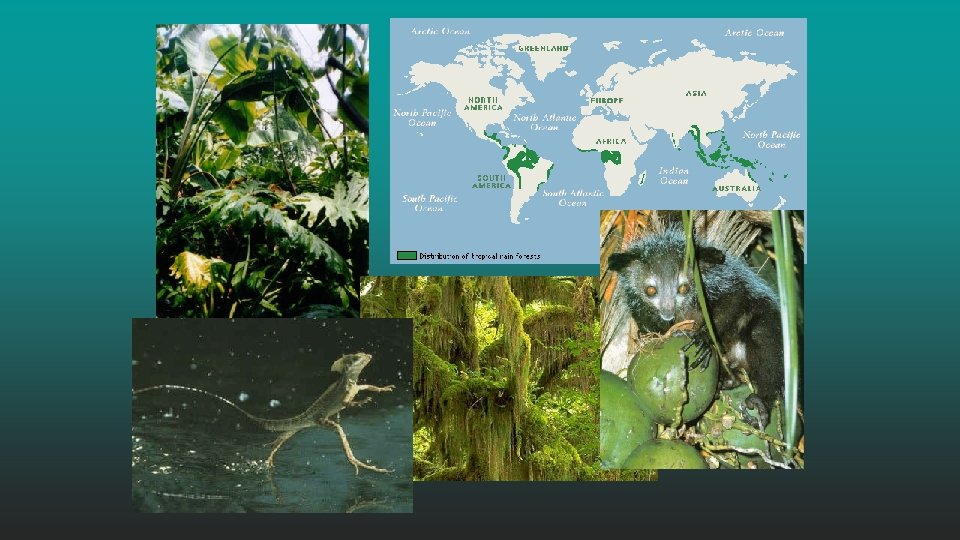 e. Rain forest • Location: anywhere with 200 cm/year precipitation and always warm. • Sunlight: Lots of sunlight, 1 season. • Soil: very fertile, supports most life of all biomes. • Plants: Large, broad leaf trees, flowers, shrubs, vines… • Animals: snakes, lizards, hummingbirds, monkeys, gorillas, tigers.