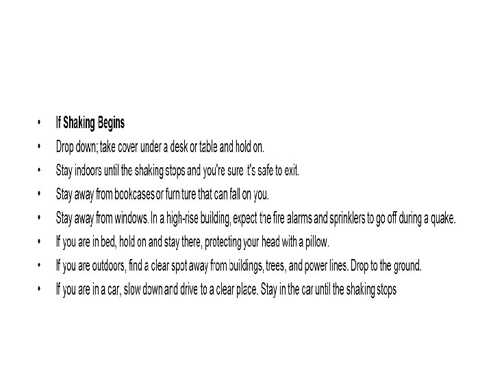 Safety Tips • • • Have an earthquake readiness plan. make your home sturdier, such as bolting bookcases to wall studs, installing trong latches on cupboards, and strapping the water heater to wall Locate a place in each room of the house that you can go to in case of an earthquake. It should be a spot where nothing is likely to fall on you. Keep a supply of canned food, an up-to-date first aid kit, 3 gallons (11. 4 liters) of water person, dust masks and goggles, and a working batteryoperated radio and flashlights. Know how to turn off your gas and water mains. .