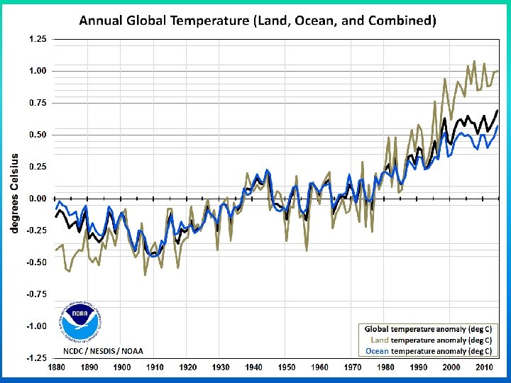 Top Ten Warmest Years on Record, 1880 -2015 RANK 1 = WARMEST PERIOD OF RECORD: 1880– 2015 YEAR ANOMALY °C ANOMALY °F 1 2015 0. 90 1. 62 2 2014 0. 74 1. 33 3 2010 0. 70 1. 26 4 2013 0. 66 1. 19 5 2005 0. 65 1. 17 6 (tie) 1998 0. 63 1. 13 6 (tie) 2009 0. 63 1. 13 8 2012 0. 62 1. 12 9 (tie) 2003 & 2006 0. 61 1. 10 9 (tie) 2007 1. 10 0. 61 https: //www. ncdc. noaa. gov/sotc/global/201513
