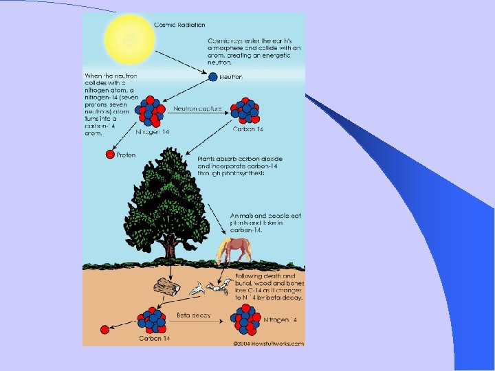 • Compare amount of radioactive isotope to a constant –Ex: Carbon 14 • Carbon 14 declines with respect to Carbon 12 • After 5715 years half Carbon 14 in a sample will have decayed (half-life) • Date objects to ~50, 000 yrs