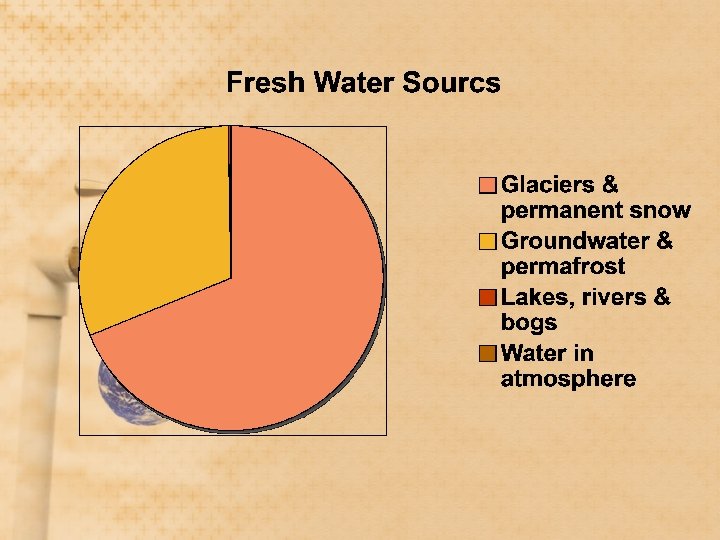 FRESH WATER RESOURCES • 1. 8% glaciers & permanent snow cover (24. 87 km 3) • 0. 8% in ground water and permafrost (10. 85 km 3) • 0. 007% lakes, rivers & bogs (1. 10 km 3) • 0. 00072% H 2 O in atmosphere (0. 01 km 3)