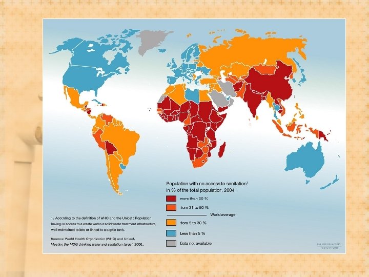 Fresh Water Resources • 70% of pop without proper sanitation live in rural areas • In sub-Sahara Africa (21 countries) - 16% of poor and 79% of rich have access to sanitation