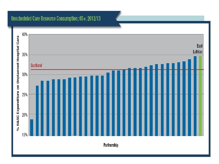 Improving efficiency and effectiveness • Commission and complete a bed modelling exercise across the total health and social care landscape to identify current and future need for provision within a quality environment. • Commission and complete a financial exercise to better understand variation in spend and costs within the HSCP • Commission and complete an exercise to map high resource use of health and social care services • Develop and agree an enabling data sharing framework • Develop a comprehensive performance monitoring framework